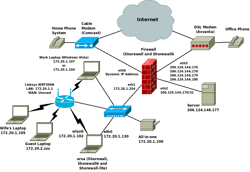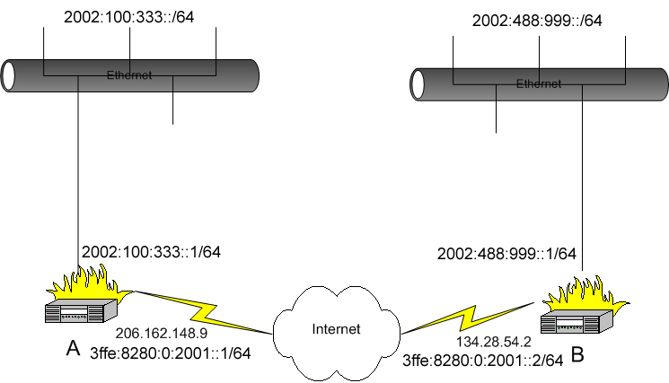 6to4 tunnels provide a good way to introduce yourself to IPv6. Shorewall6 was developed on a network whose only IPv6 connectivity was an 6to4 Tunnel; that network is described in the remainder of this section. What is shown here requires Shorewall6 4.2.4 or later.